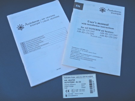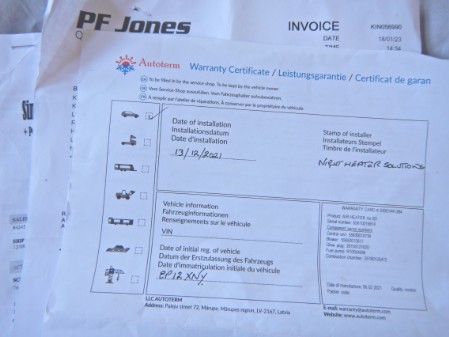 The Autoterm heater is still under warranty and the purchase receipt, installation certificate and warranty information are included.